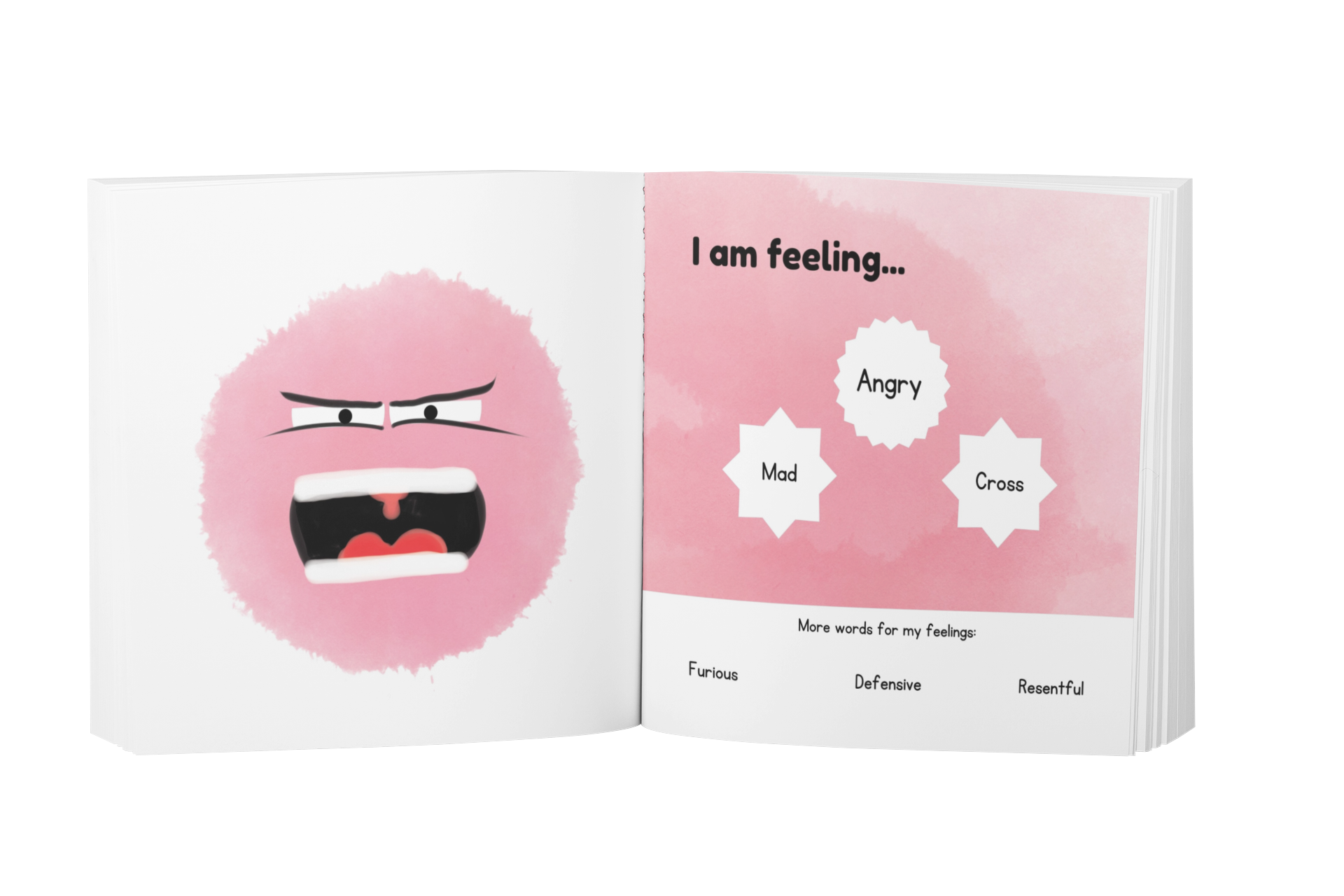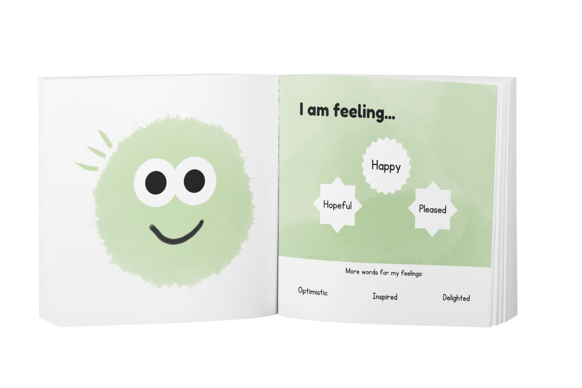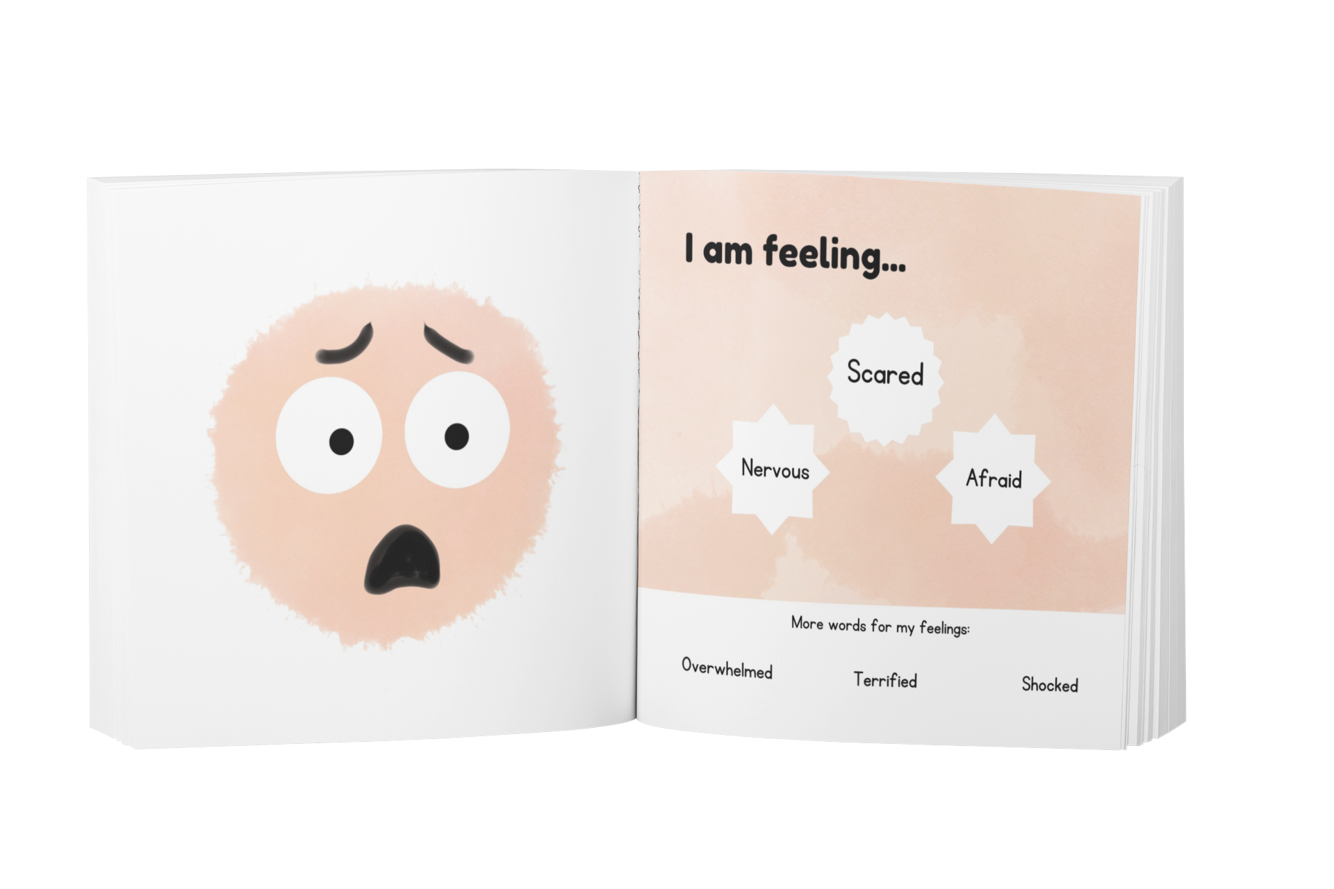 Each page has six words to describe an emotion, three toddler-friendly words, and three words for those children who gobble up learning.